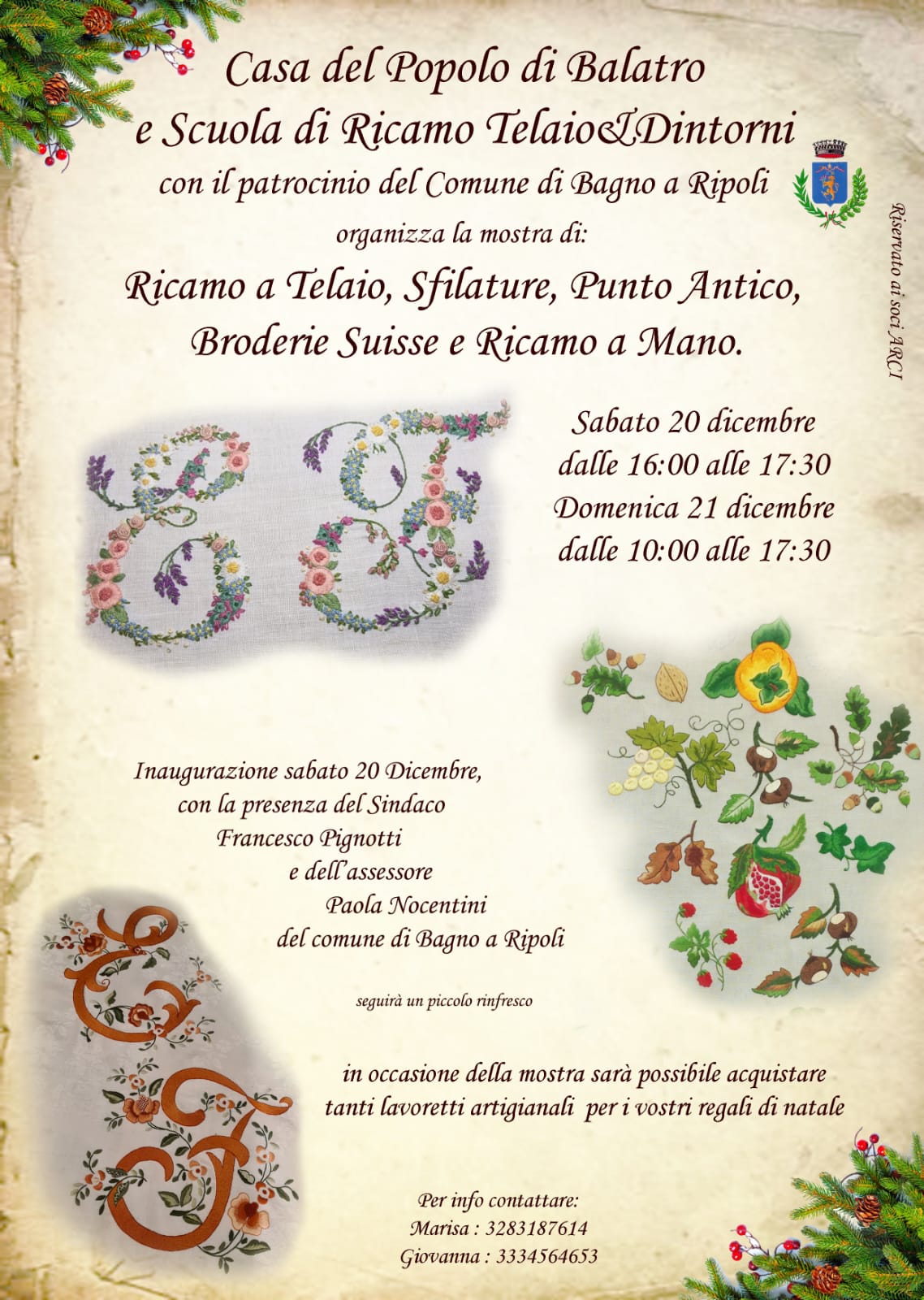 La Casa del Popolo di Balatro si prepara ad accogliere un fine settimana all’insegna della tradizione e dell’artigianato con la mostra dedicata al ricamo e alle antiche tecniche tessili, organizzata dalla Scuola di Ricamo Telaio & Dintorni di Marisa Pesci, con il patrocinio del Comune di Bagno a Ripoli. Un appuntamento che celebra il valore del lavoro manuale e della creatività, riportando al centro saperi che si tramandano da generazioni.