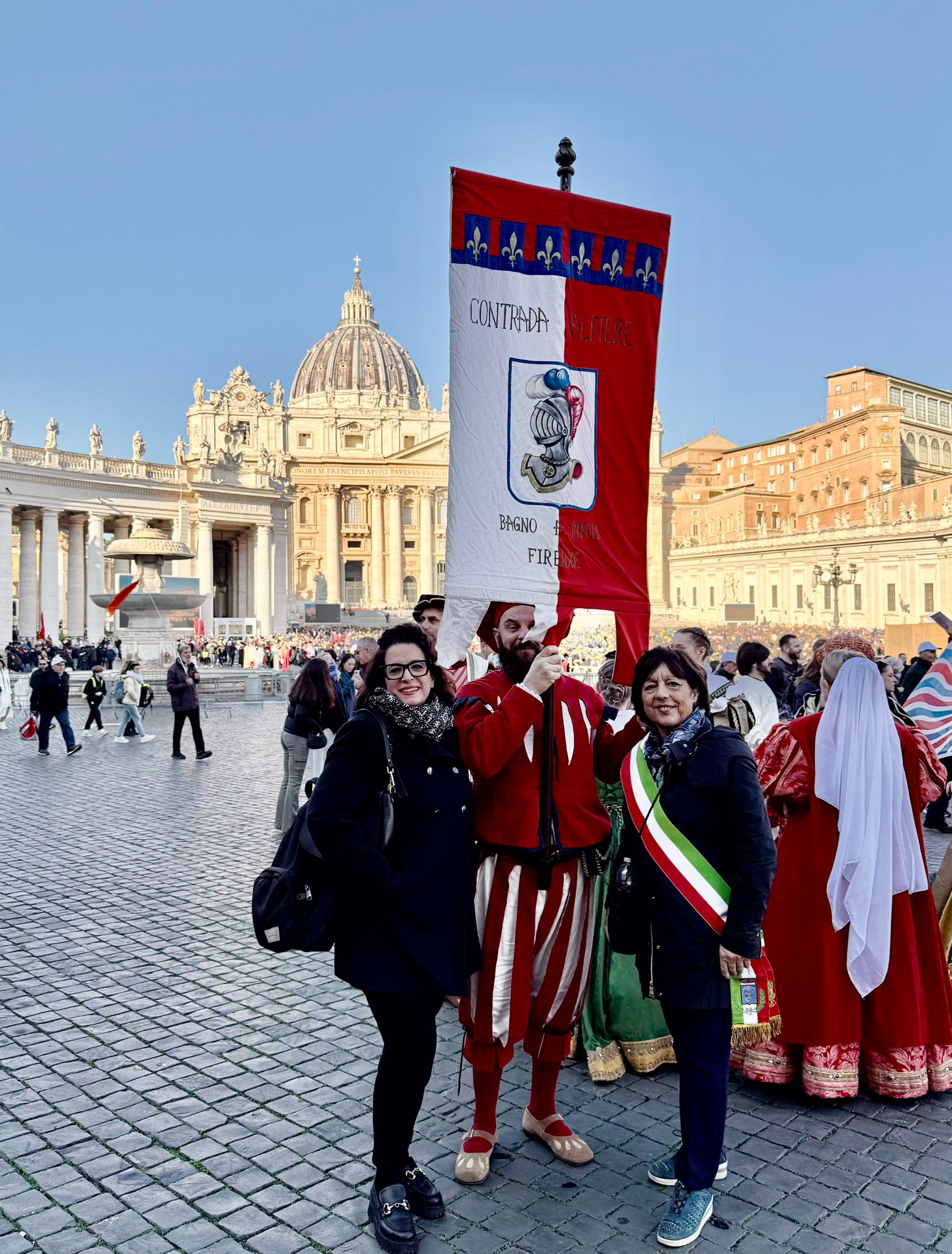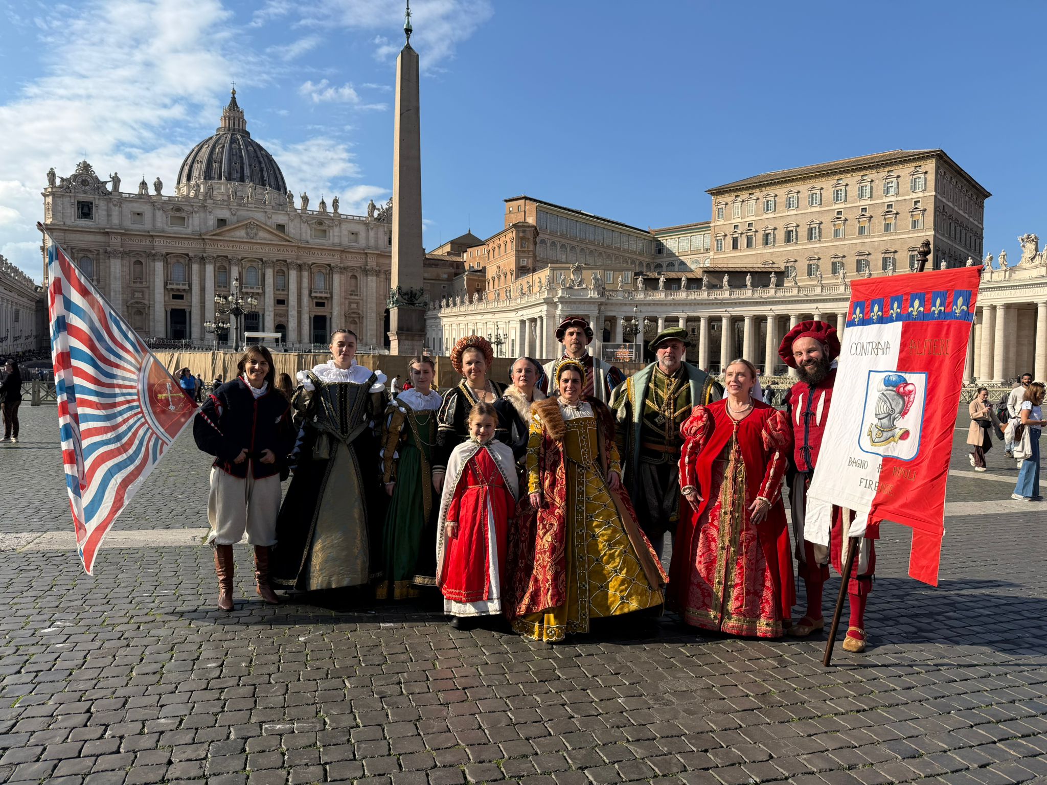 I figuranti della Contrada – in abiti d’epoca, con vessilli, stemmi e ricostruzioni fedeli dei costumi del periodo – hanno preso parte al corteo che ha attraversato Piazza San Pietro per poi partecipare all’udienza pontificia e alla celebrazione giubilare. A rappresentare ufficialmente il Comune di Bagno a Ripoli erano presenti l’assessora alle tradizioni storiche Paola Nocentini e la consigliera comunale Katia Bruzzese, che hanno accompagnato la delegazione ripolese per l’intera giornata.