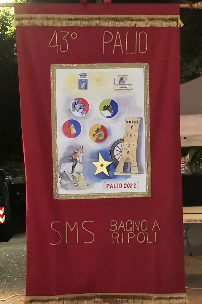 Si tratta di un drappellone all’insegna della semplicità, che non lascia spazio all’immaginazione. Vi sono raffigurati i simboli delle quattro contrade (Cavallo, Torre, Mulino, Alfiere), il gonfalone di Bagno a Ripoli e il balcone della stanza del sindaco. A trasformare il disegno in drappellone di stoffa, le abili mani di Mila Scatena che lo ha illustrato al sindaco Francesco Casini e a tutta la giunta presente alla cena.