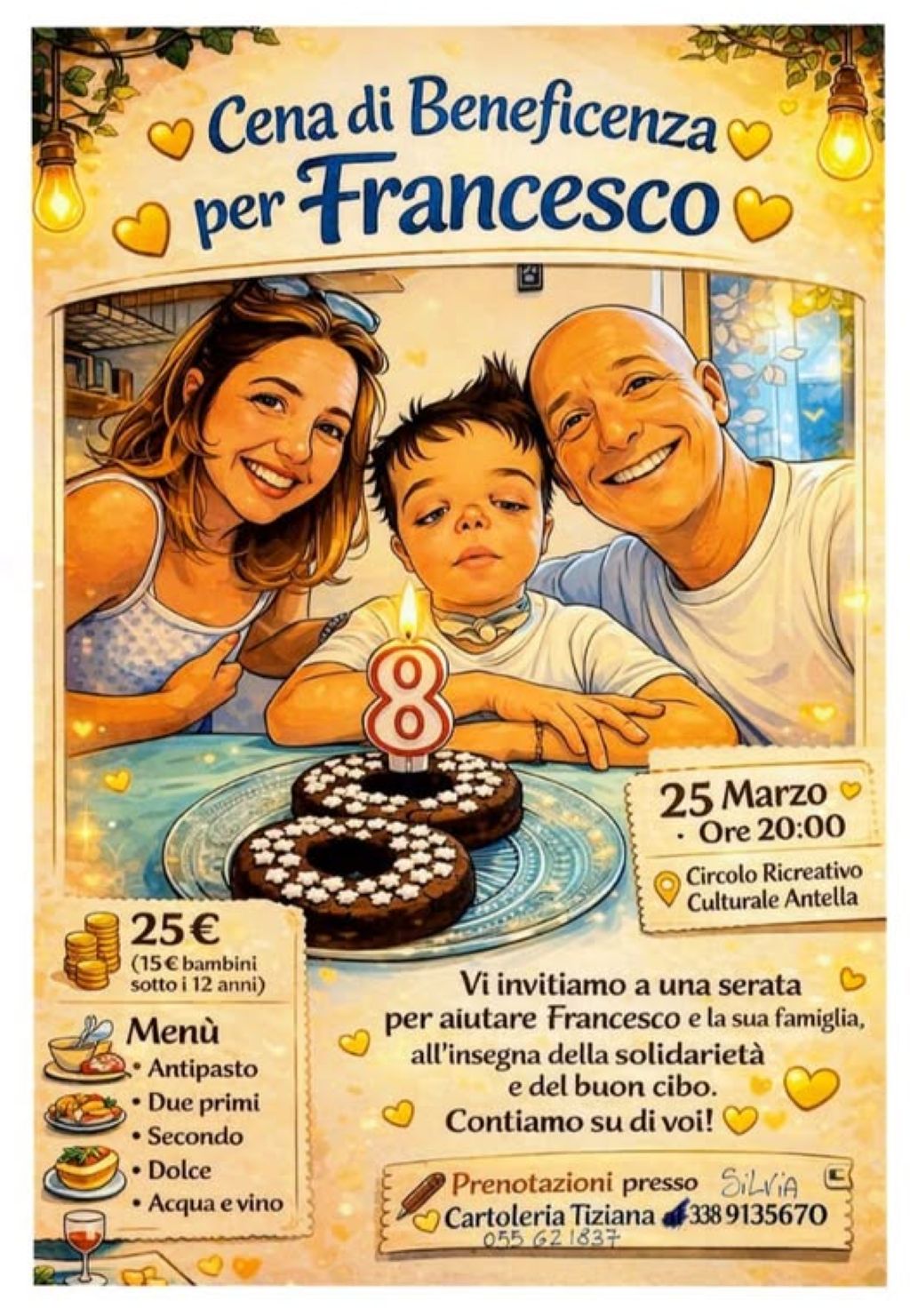 L’iniziativa nasce con l’obiettivo di aiutare il piccolo Francesco, che deve tornare a Parigi per un nuovo intervento chirurgico, e i suoi cari a sostenere le spese per la costosa trasferta. La cena sarà un momento di comunità, vicinanza e sostegno. Un gesto collettivo che dimostri, ancora una volta, quanto il tessuto sociale dell’Antella e di tutta la comunità ripolese sappia mobilitarsi quando c’è bisogno.