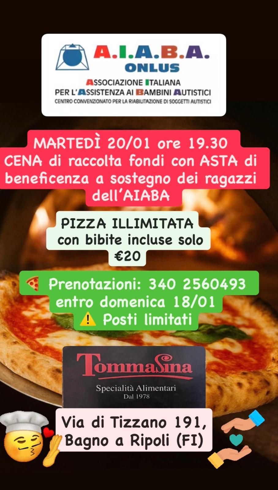 Il menù della serata prevede pizza illimitata (con molteplici gusti a disposizione) e bibite incluse, al costo di 20 euro. Durante la cena sarà possibile partecipare a un’asta di beneficenza, il cui ricavato andrà a sostenere le attività dell’associazione.