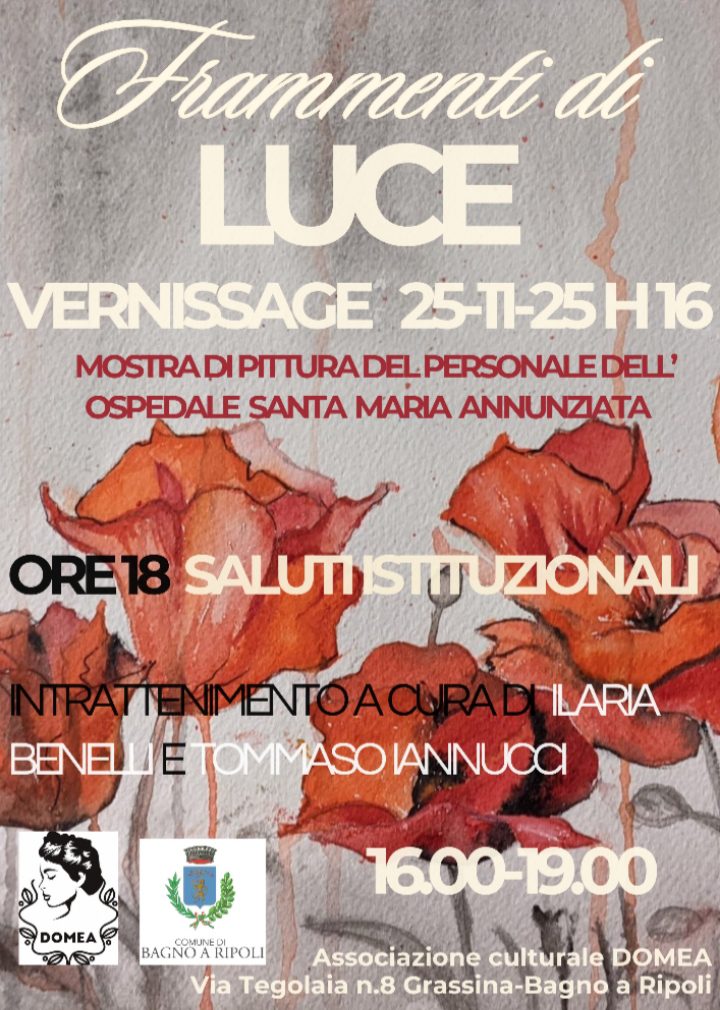 Martedì 25 novembre, l’associazione DoMeA – Donne nei mestieri delle arti ospita la mostra di pittura del personale dell’ospedale Santa Maria Annunziata di Ponte a Niccheri. L’esposizione, dal titolo “Frammenti di luce”, nasce per indicare la speranza e la forza delle donne. La mostra riunisce una ventina di opere e sarà visitabile dalle 16 alle 19 presso la sede dell’associazione in via Tegolaia 8 a Grassina. Alle 18 vi saranno i saluti istituzionali e un intrattenimento musicale a cura di Ilaria Benelli e Tommaso Iannucci.