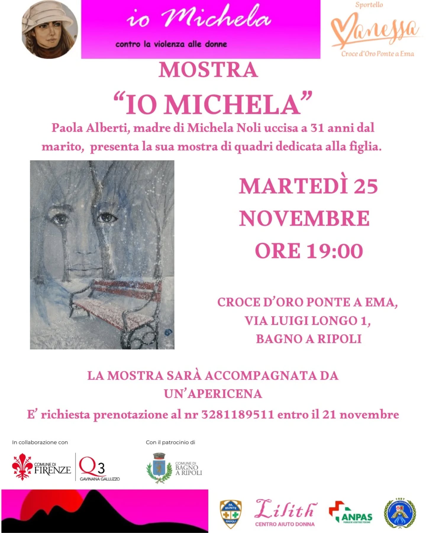 L’arte come denuncia, memoria, impegno contro ogni violenza. Accade con la mostra “Io Michela”, raccolta di opere di Paola Alberti, mamma di Michela Noli, la giovane trucidata nel 2016, a soli 31 anni, dall’ex marito nel quartiere dell’Isolotto, a pochi passi da casa. Attraverso le sue opere, Paola mantiene vivo il ricordo della figlia, per dire basta ai femminicidi (vedi articolo). La mostra, martedì 25 novembre, sarà visitabile nei locali dello Sportello Vanessa, presso la sede della Croce d’Oro di Ponte a Ema. L’iniziativa, che si svolge con il patrocinio del Comune, sarà accompagnata da un apericena. Prenotazioni al 3281189511. Appuntamento alle ore 19.00 in via Luigi Longo 1, Ponte a Ema.