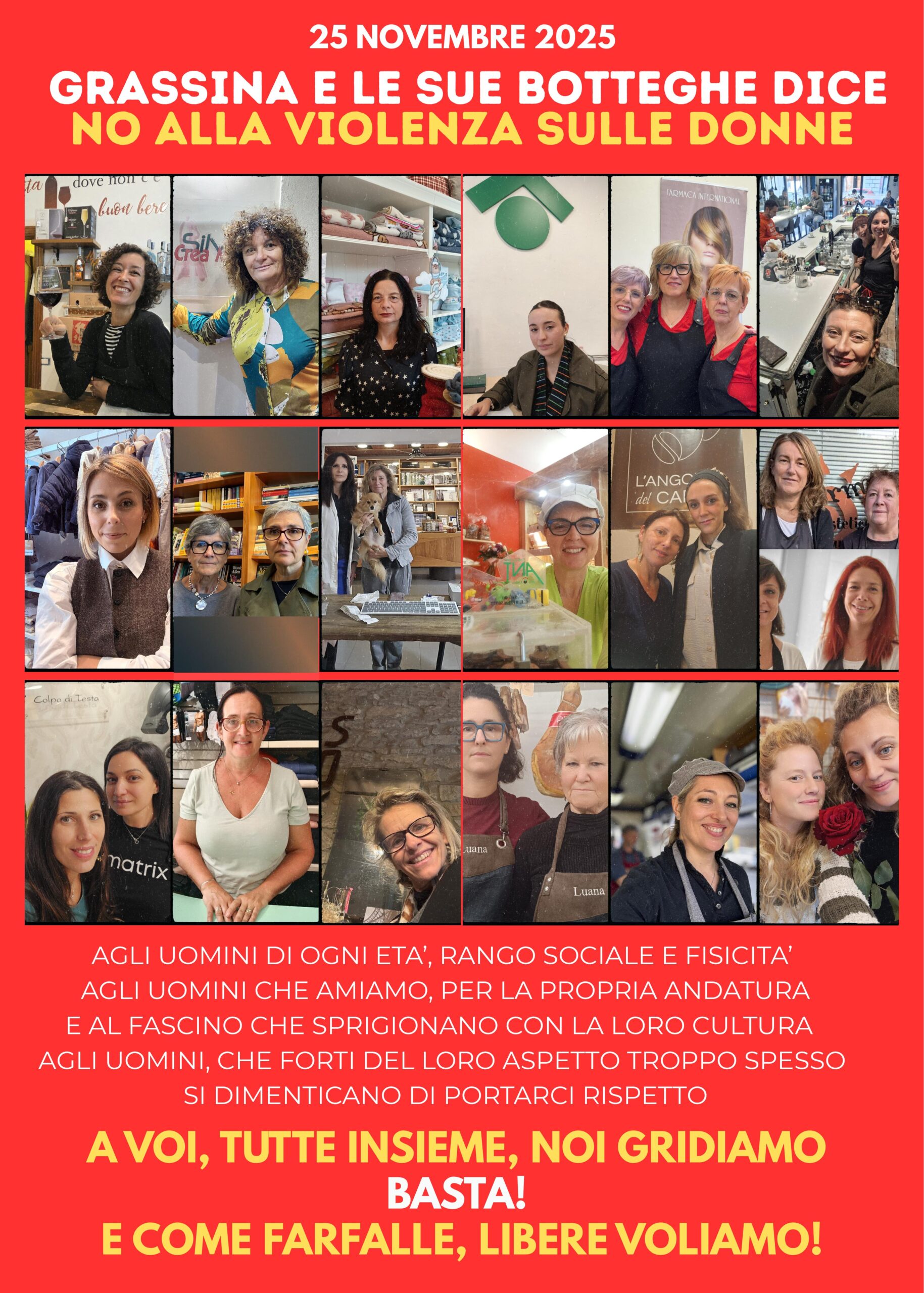 In occasione della Giornata internazionale per l’eliminazione della violenza contro le donne, le attività commerciali di Grassina esporranno sulle loro vetrine un manifesto rosso per dire basta ai femminicidi. L’iniziativa, promossa dal CCN Grassina e le sue botteghe, porterà le negozianti grassinesi a metterci letteralmente “la faccia”. Il manifesto ritrae i volti delle esercenti, accompagnati da alcune frasi per dire stop alla violenza di genere.
