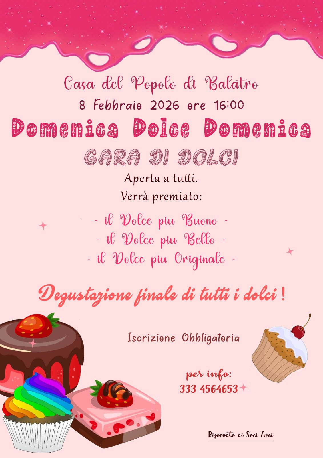 Un pomeriggio all’insegna della creatività e della golosità: domenica 8 febbraio, a partire dalle ore 16, la Casa del Popolo di Balatro ospiterà “Domenica Dolce Domenica”, una gara di dolci aperta a tutti, pensata per mettere alla prova fantasia, gusto e passione per la pasticceria casalinga.