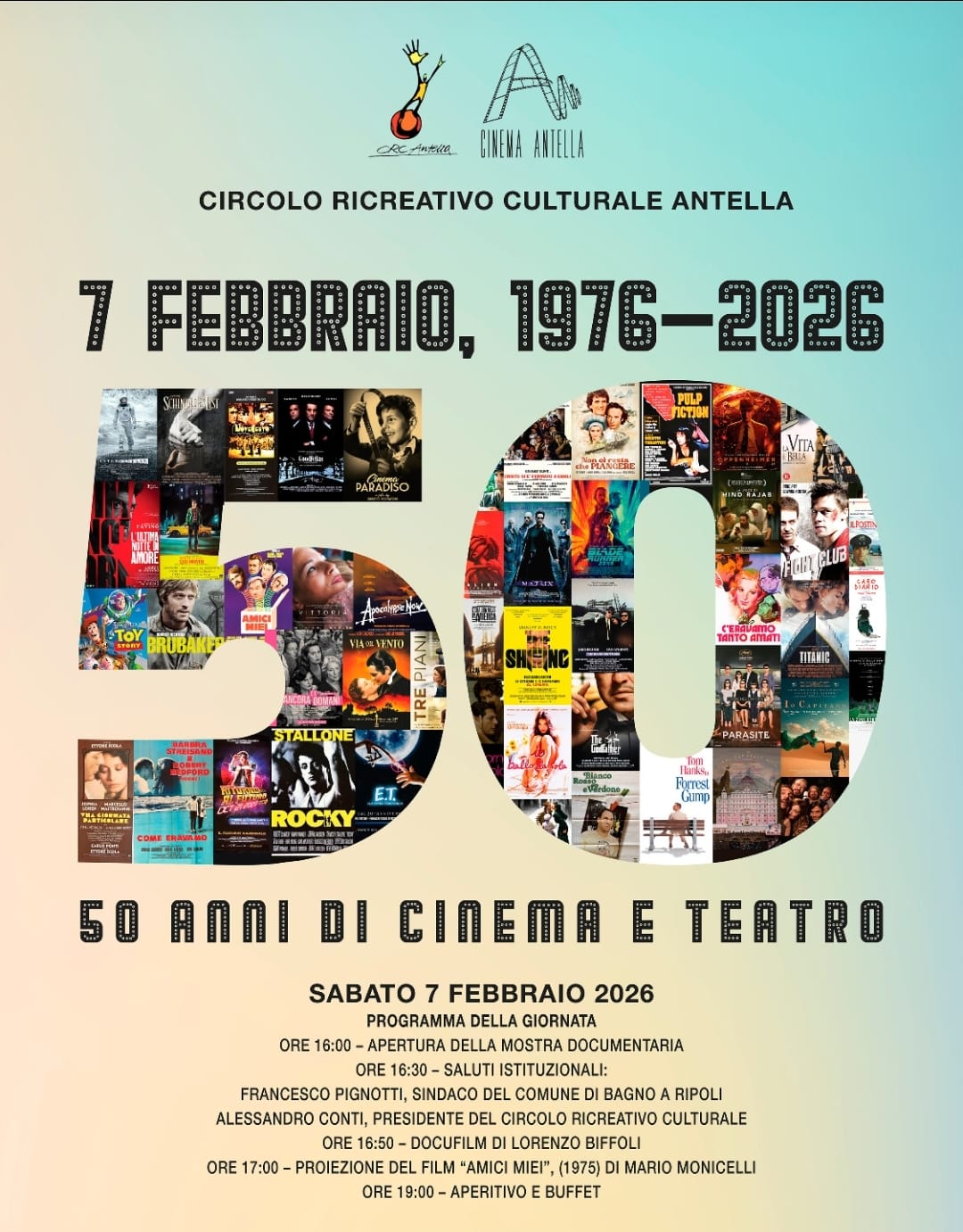E da quel momento, un film dopo l’altro, si arriverà al prossimo sabato, 7 febbraio 2026, quando il Crc Antella festeggerà le “nozze d’oro” del proprio cinema con il pubblico che non ha mai smesso di frequentarlo. Prima di quel 7 febbraio di cinquanta anni fa i film venivano proiettati nell’ex sede della Casa del popolo, dove ora c’è il Teatro Comunale, in via di Montisoni.