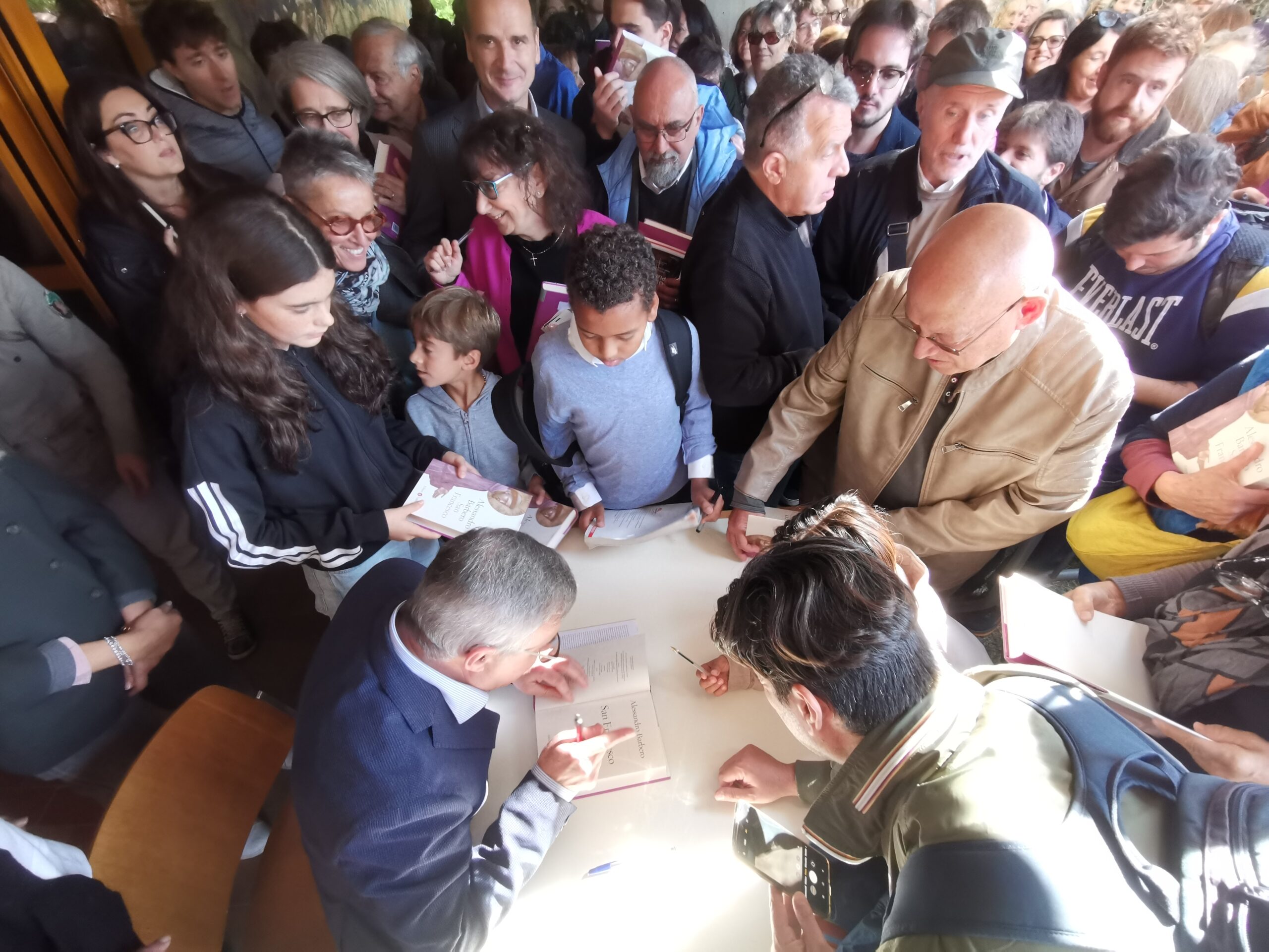 Dopo lo show da grande divulgatore, chiuso con applausi scroscianti, si è aperta l’attesa parentesi del “firma libro”. Tutti in coda per un autografo del professore. Che è un po’ come avere quello di San Francesco.
