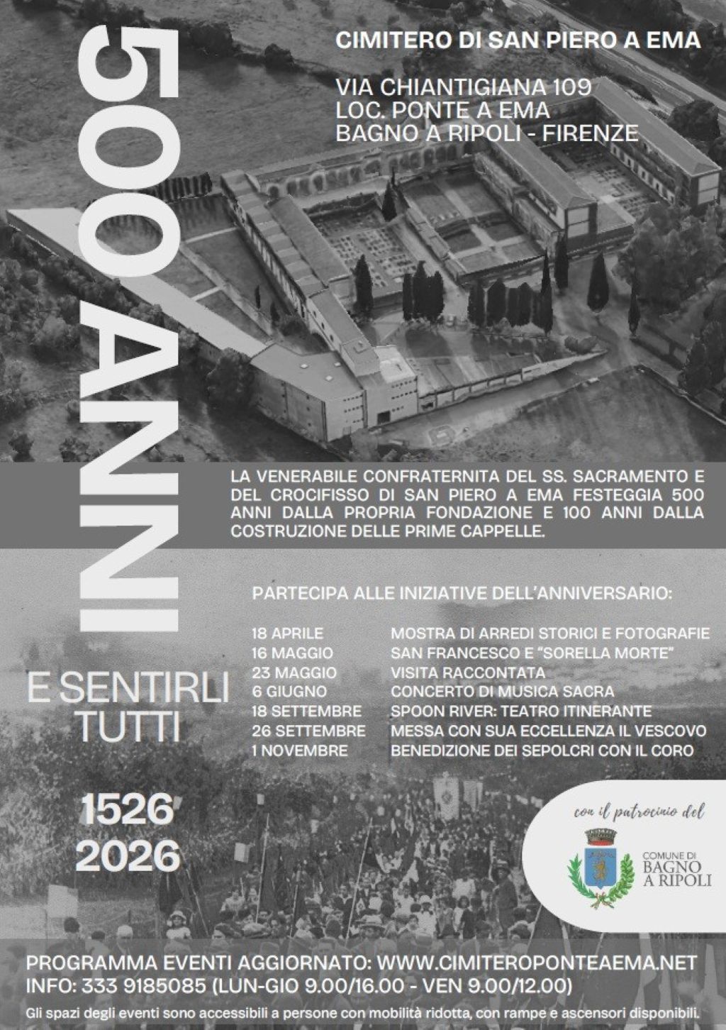 “500 anni e sentirli tutti”. Mezzo millennio per la Confraternita di San Piero a Ema, cento invece per il cimitero. Due anniversari importanti festeggiati con un programma ricco di appuntamenti culturali pensati per rendere omaggio a un pezzo di storia del territorio e della comunità. A distanza di cinquecento anni dalla fondazione della venerabile Confraternita del SS Sacramento e del Crocifisso di San Piero a Ema e a un secolo dalla realizzazione delle prime cappelle funerarie, le celebrazioni si apriranno il 18 aprile con l’inaugurazione della mostra di arredi storici e fotografie della Confraternita e del cimitero (ore 16.00).