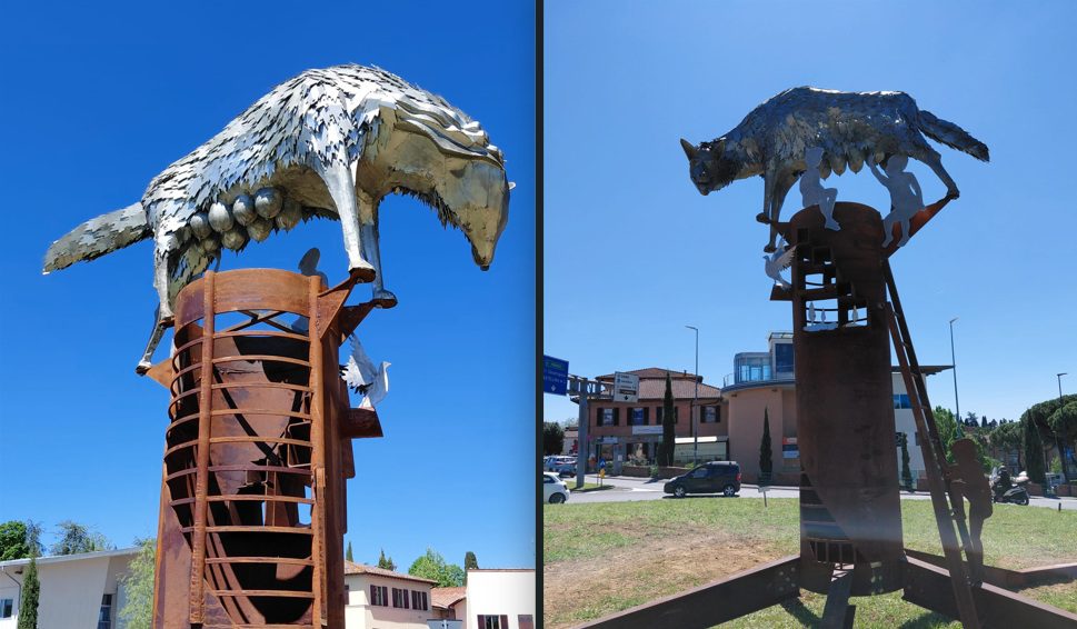 La scultura inaugurata a Fontebecci propone una rilettura contemporanea della lupa: non più figura aggressiva, ma simbolo di accoglienza. La testa è reclinata verso tre bambini – due già presenti e un terzo che sta salendo – a rappresentare un’umanità universale. “Il terzo bambino è tutti: il bianco, il nero, l’uomo, la donna”, ha spiegato l’artista.