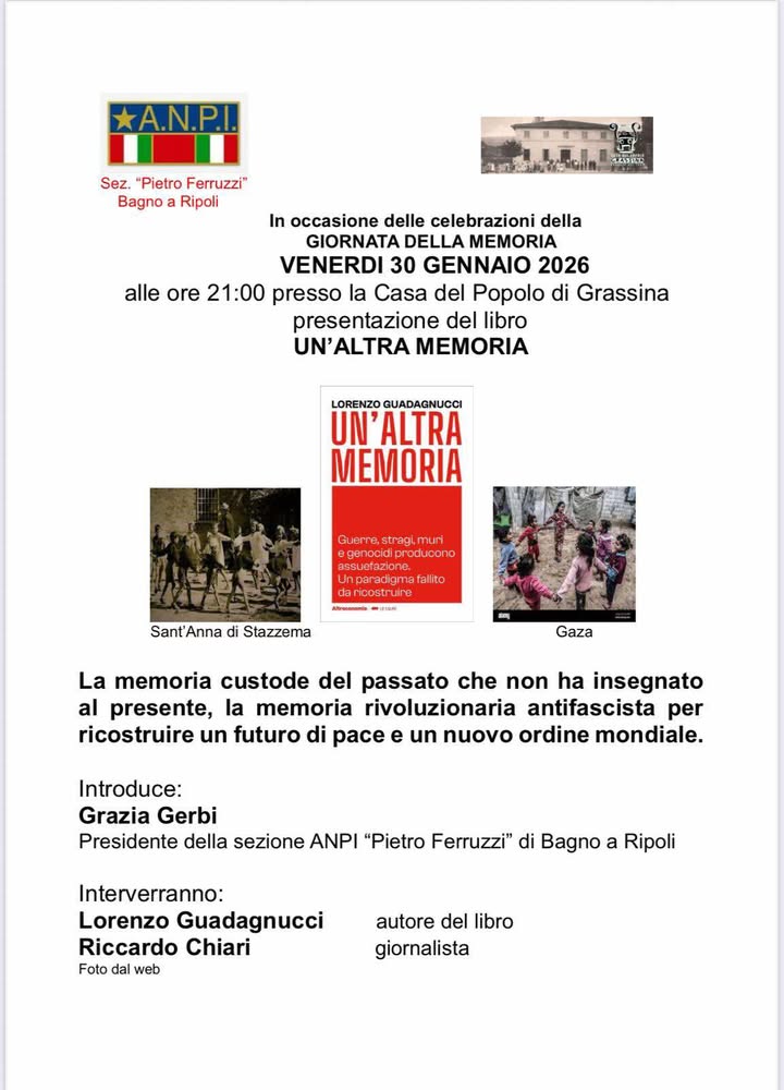Venerdì 30 gennaio, alle ore 21:00, la Casa del Popolo di Grassina ospiterà un appuntamento nell’ambito della Giornata della Memoria. La sezione Anpi “Pietro Ferruzzi” di Bagno a Ripoli presenta il libro di Lorenzo Guadagnucci, “Un’altra memoria”, un’opera che invita a riflettere sul fallimento dei vecchi paradigmi celebrativi di fronte al persistere di guerre e genocidi.