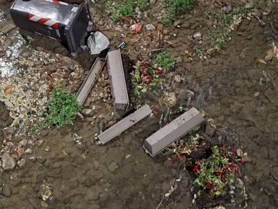 Buttati nell’Ema bidoncini e fioriere del ponte della chiesa, sradicata una centralina, spaccata la serratira del cancello dell’Acli