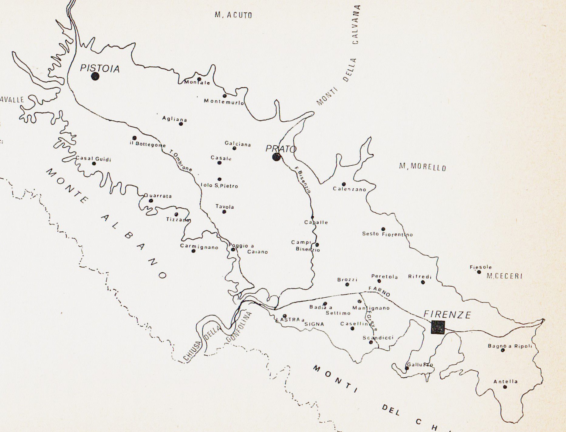 In realtà, il lago non cominciava da Firenze, ma ben oltre una decina di chilometri verso sud-est fino alla barriera montuosa del Poggio Firenze che lo separava dal bacino del Valdarno Superiore – proprio da Antella, come si può vedere nella cartina qui sotto riprodotta.