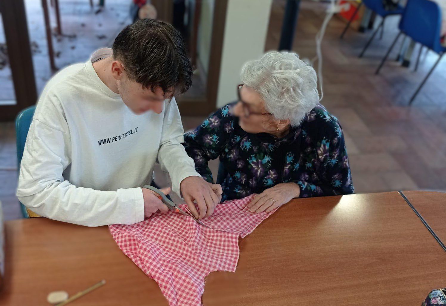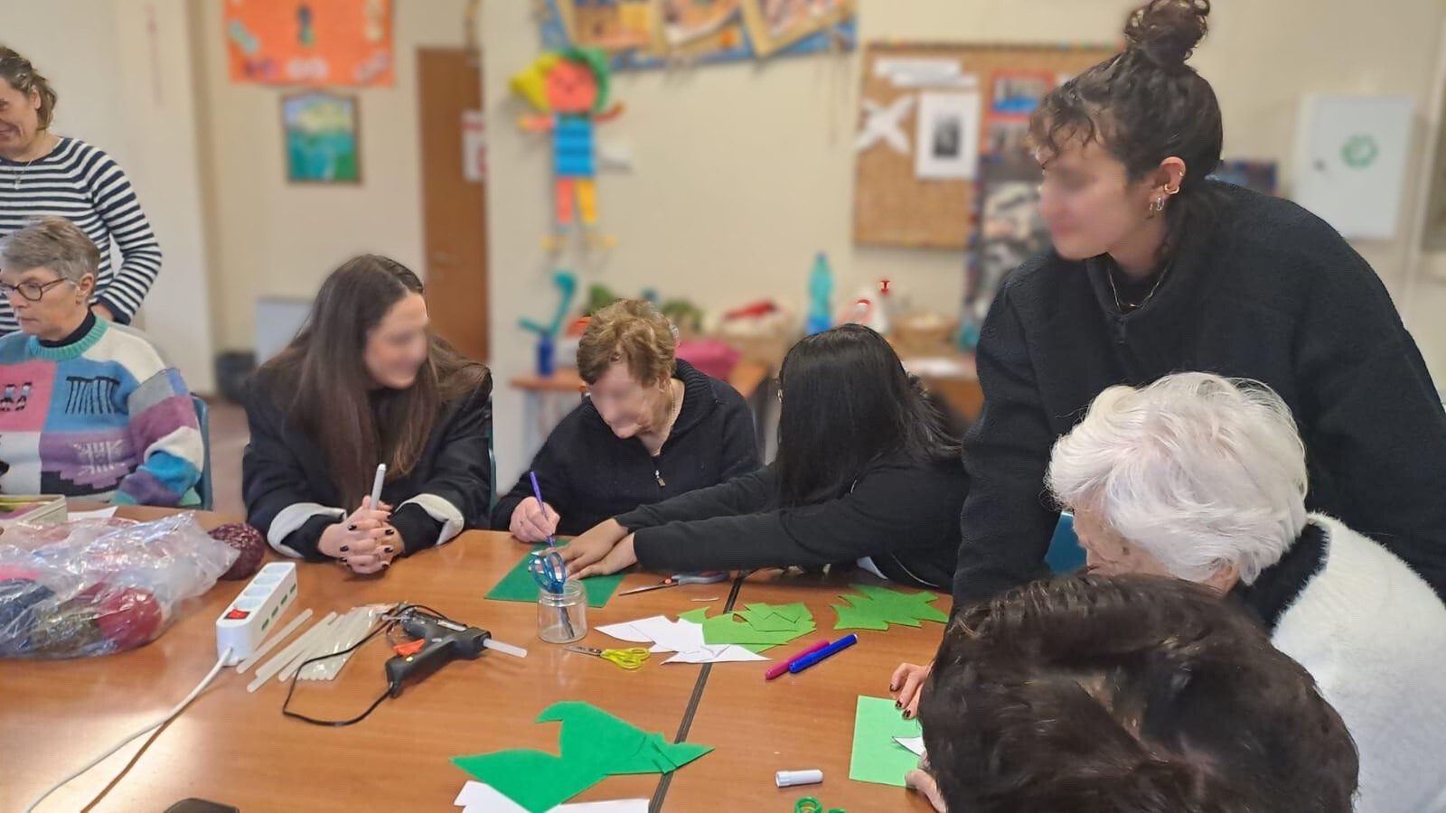 I ragazzi, in tutto 6, tra i 12 e 19 anni, hanno fatto visita all’Atelier di Nomos dedicato alle persone che vivono la demenza, hanno conosciuto le dieci “nonne” (sono tutte donne) che lo frequentano regolarmente: insieme, sotto la supervisione di operatori ed educatori hanno fatto attività creative e ricreative. Hanno costruito addobbi in feltro per l’albero di Natale, hanno realizzato un cartellone con le cose da lasciare al 2025 e quelle che si augurano per il 2026, e infine hanno realizzato un calza piena di caramelle per la Befana.