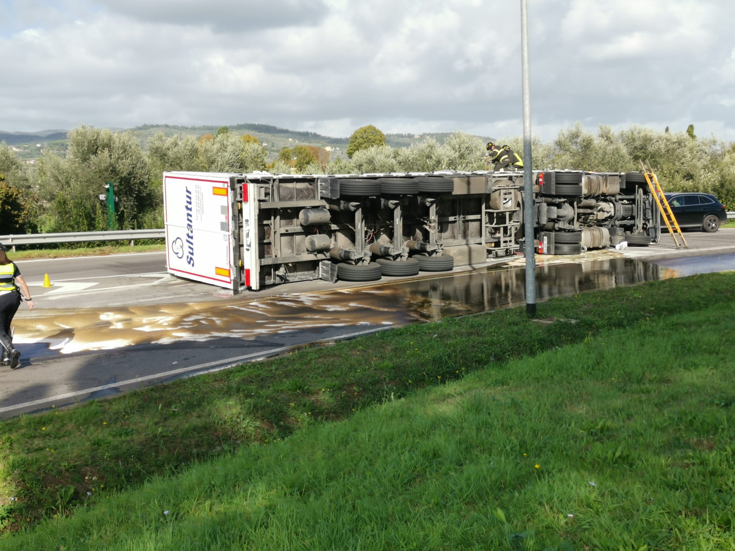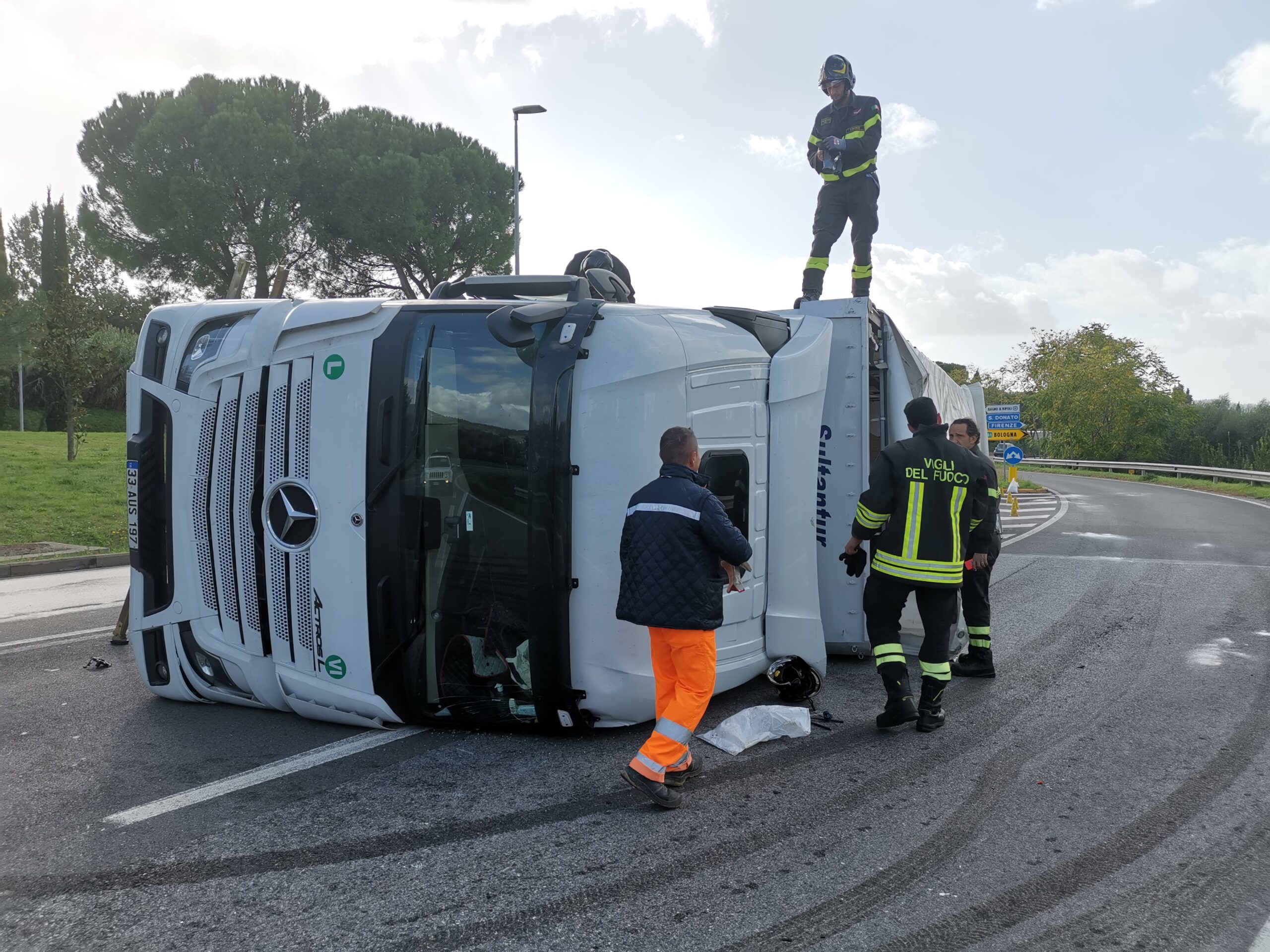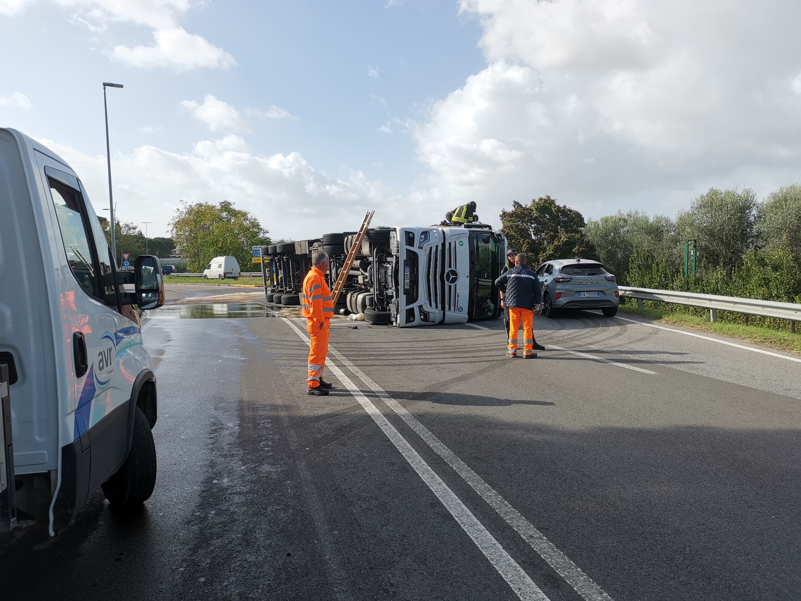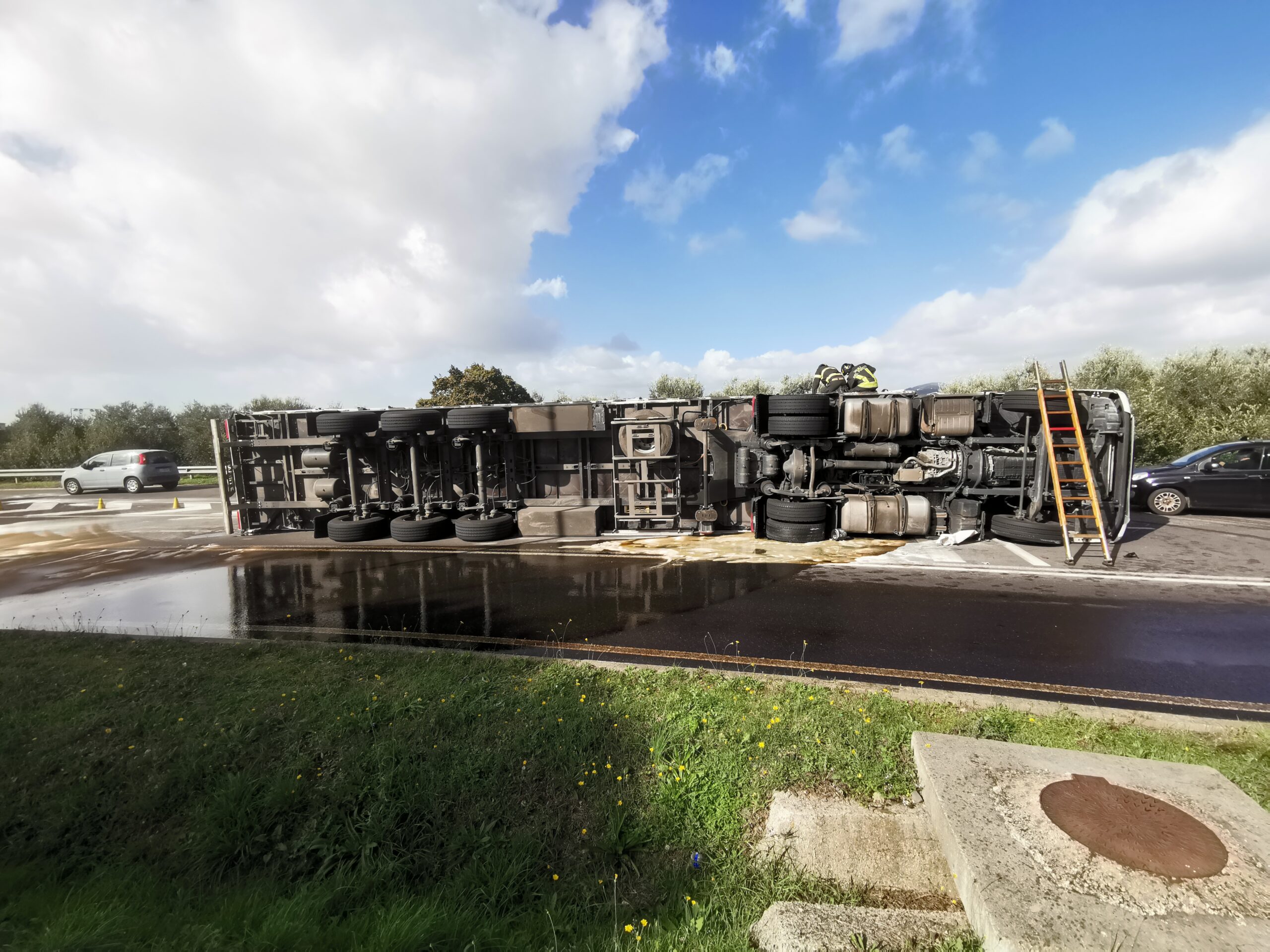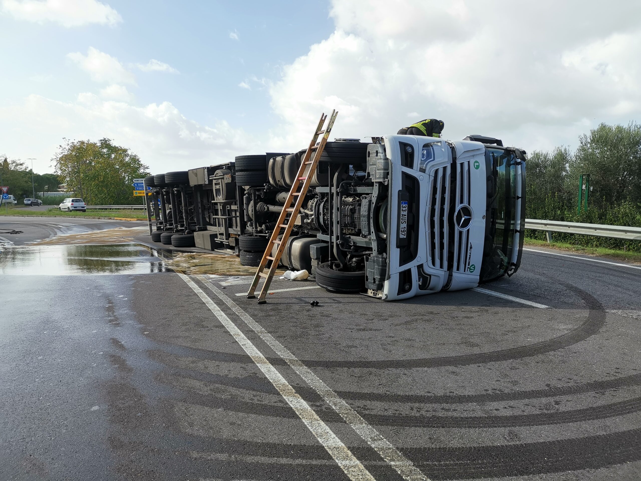 Il mezzo dovrà essere svuotato dal carico (parti meccaniche di ricambio) per poter essere rialzato e si sta provvedendo alla bonifica della carreggiata in seguito allo sversamento di gasolio dal serbatoio.