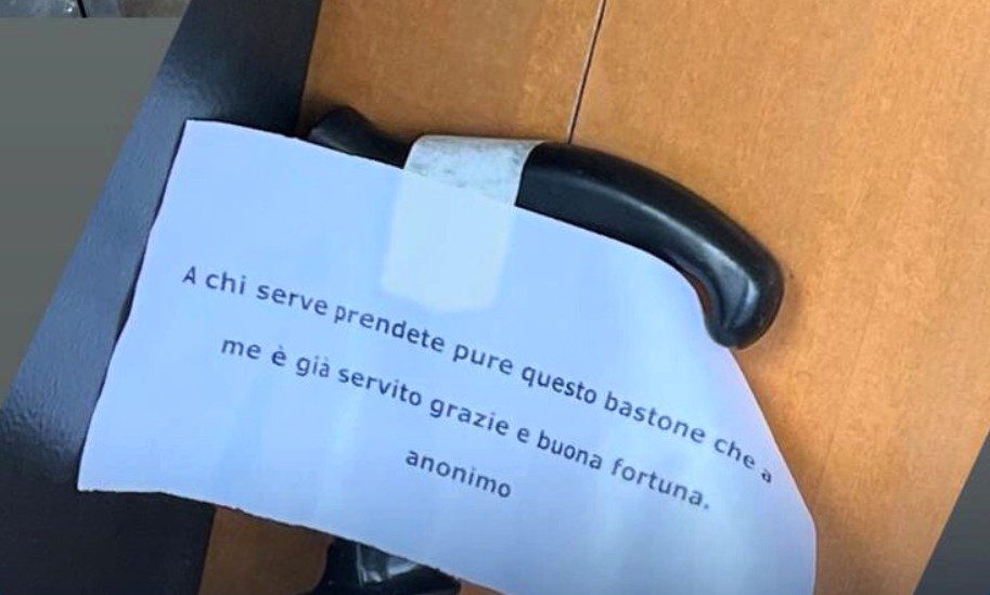 Un piccolo gesto, semplice e silenzioso, capace però di raccontare molto più di tante parole. All’ingresso dell’ospedale Santa Maria Annunziata è stato trovato un dono anonimo: un bastone per la deambulazione, lasciato a disposizione di chi ne avesse bisogno, accompagnato da un messaggio: “A chi serve prendete pure questo bastone che a me è già servito, grazie e buona fortuna. Anonimo”.