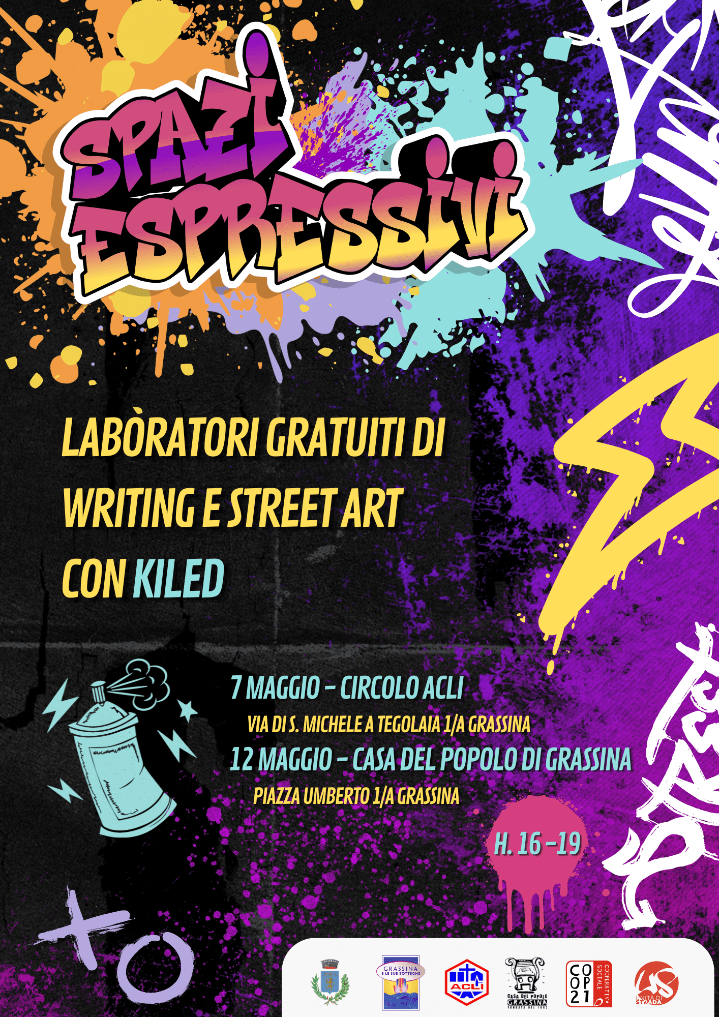 Il cuore del progetto sono due laboratori gratuiti di writing e street art curati dall’artista Kiled, in programma il 7 maggio all’Acli di Grassina (via san Michele a Tegolaia 1/A) e il 12 maggio alla Casa del popolo di Grassina (piazza Umberto I), sempre dalle 16.00 alle 19.00. La partecipazione è libera, non è necessaria l’iscrizione.